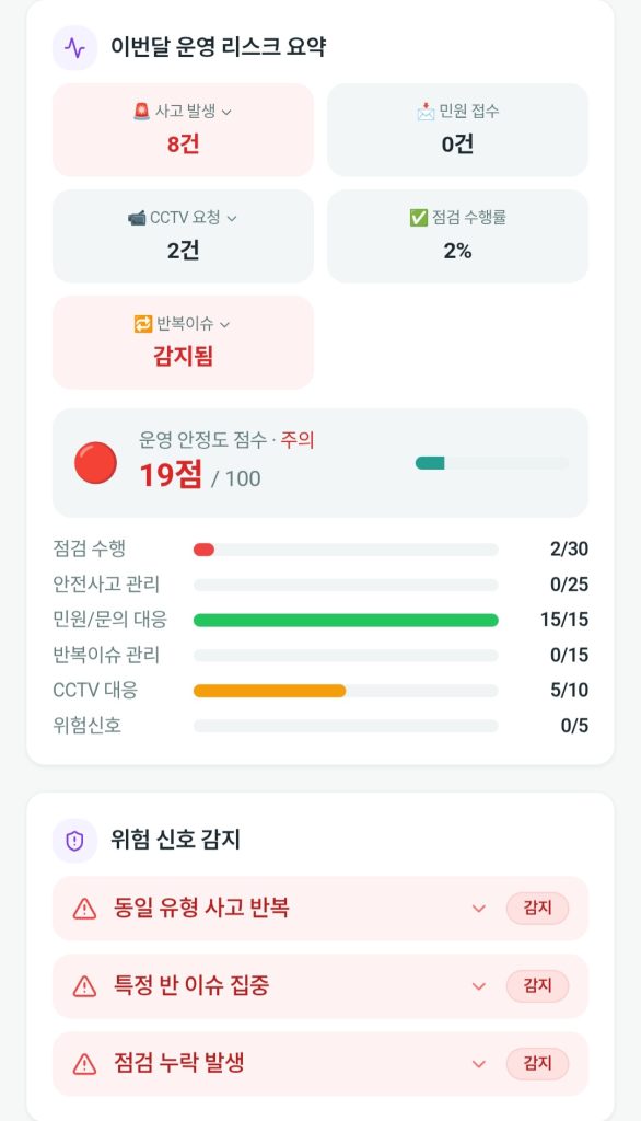 이번 달 운영 리스크 🚨 사고 발생1건 📨 민원 접수2건 📹 CCTV 요청 1건 ⚠ 반복 이슈 2건