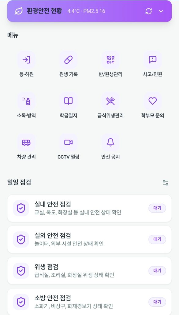 원내 소독,주방 위생,시설 점검을 간단한 체크로 기록할 수 있습니다. [매일 운영 기록을 체계적으로 관리합니다]